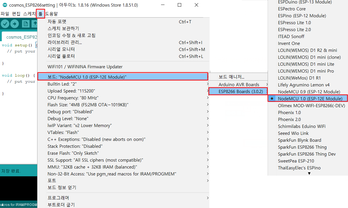 아두이노 IDE에서 툴-보드-NodeMCU 1.0(ESP-12E Module)를 선택합니다.