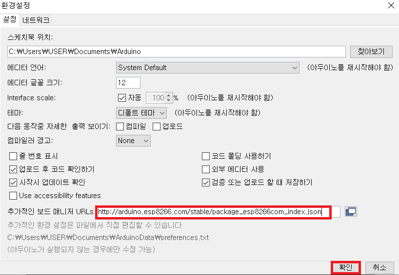 아두이노 IDE에서 파일 - 환경설정을 클릭 후 사진에 표시된 곳에 다음 링크를 적어줍니다.