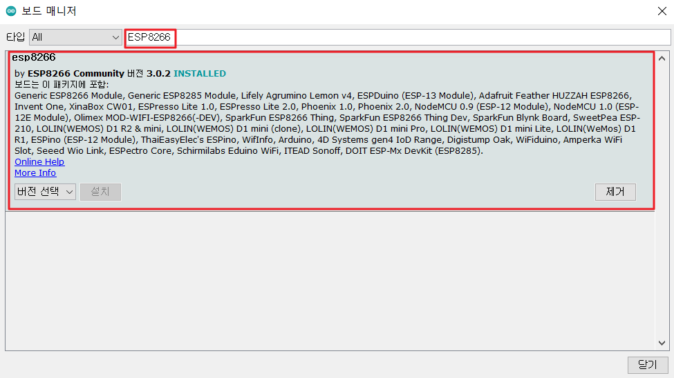보드매니저에서 'ESP8266'을 검색하여 'ESP8266 Community'를 설치해줍니다.
